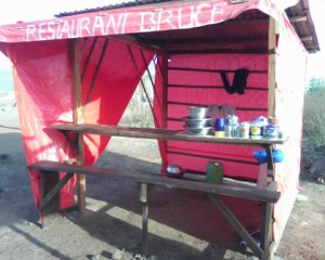 En 2013, Lamine a démissionné. Il avait travaillé six jours par semaine pendant 5 ans pour ne gagner que 100 $ par mois (89 euros), payés par la multinationale qui l’employait ; pas vraiment un salaire de famine selon les standards maliens, mais bien loin d’être assez pour lui permettre de se marier et de fonder une famille. Atteignant la quarantaine, l’agent de sécurité n’avait aucune perspective de promotion et commençait à s’inquiéter de chercher fortune ailleurs. Il vendit l’ordinateur portable que je lui avait donné et investit le profit qu’il en avait tiré dans un restaurant que l’on peut voir ci-dessous (je n’ai pas interrogé Lamine sur les droits au nom, tout ça était son idée à lui.)